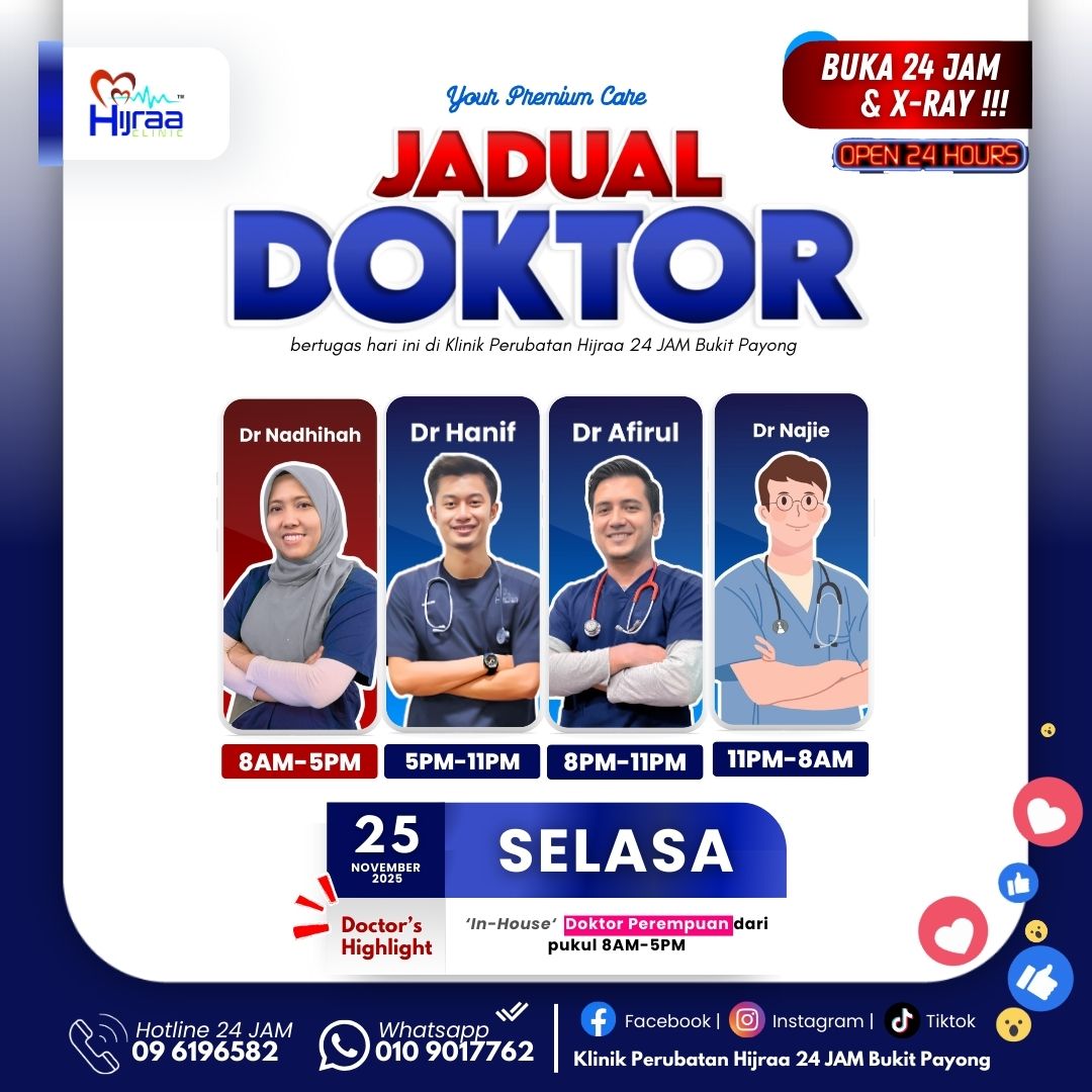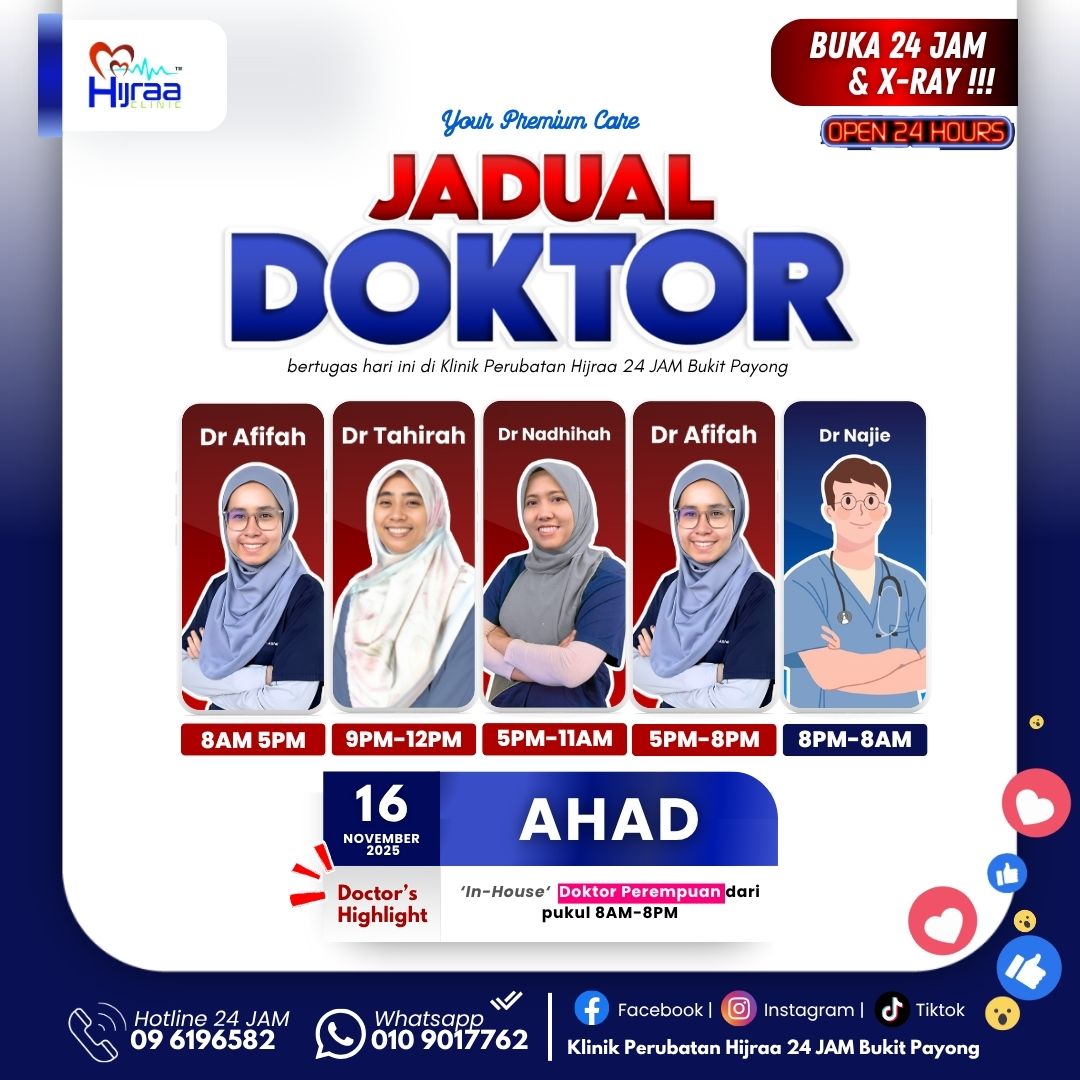 EXCELLENT Based on 2370 reviews Hafidz Nasir2025-05-25Trustindex verifies that the original source of the review is Google. Servis pantas, anak suka datang sini. Terbaik syazwani sabri2025-05-25Trustindex verifies that the original source of the review is Google. Servis pantas, staff baik, penyabar, mesra, fasiliti bagus dan bersih A++ Sitinurizzahanis Zainudin2025-05-25Trustindex verifies that the original source of the review is Google. Sangat mesra pelanggan NUR IZZATUL AINA KHAIRUL ASMADI2025-05-25Trustindex verifies that the original source of the review is Google. Highly recommend this clinic! The staff is friendly, the facility is clean, and the care I received was professional and thorough. I felt well taken care of from start to finish. #KlinikHijraa24Jam Alya syahira2025-05-24Trustindex verifies that the original source of the review is Google. Terima kasih bagi layanan penuh mesra utk saya, klinik sangat bersih dan sangat selesa🤗 MUHAMMAD FADHLI HAKIM2025-05-24Trustindex verifies that the original source of the review is Google. sangat berpuas hati..servis sangat memuaskan..harga berpatutan Peyo Link2025-05-23Trustindex verifies that the original source of the review is Google. Alhamdulillah Amri hamizah2025-05-23Trustindex verifies that the original source of the review is Google. Klinik yg sgt selesa.. staff & doktor yg peramah.. servis memuaskam👍 Api Terbang2025-05-23Trustindex verifies that the original source of the review is Google. Dr overall okVerified by TrustindexTrustindex verified badge is the Universal Symbol of Trust. Only the greatest companies can get the verified badge who has a review score above 4.5, based on customer reviews over the past 12 months. Read more